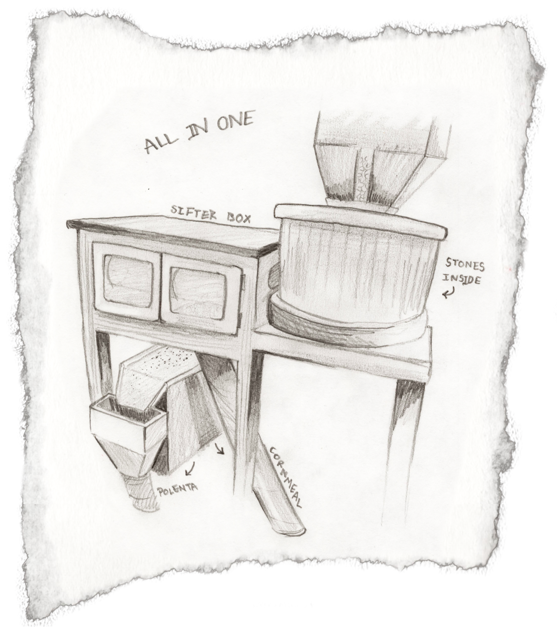 We grind the wheat between granite stones. The whole berry or grain goes into the mill stones; bran, germ, starch, and all.