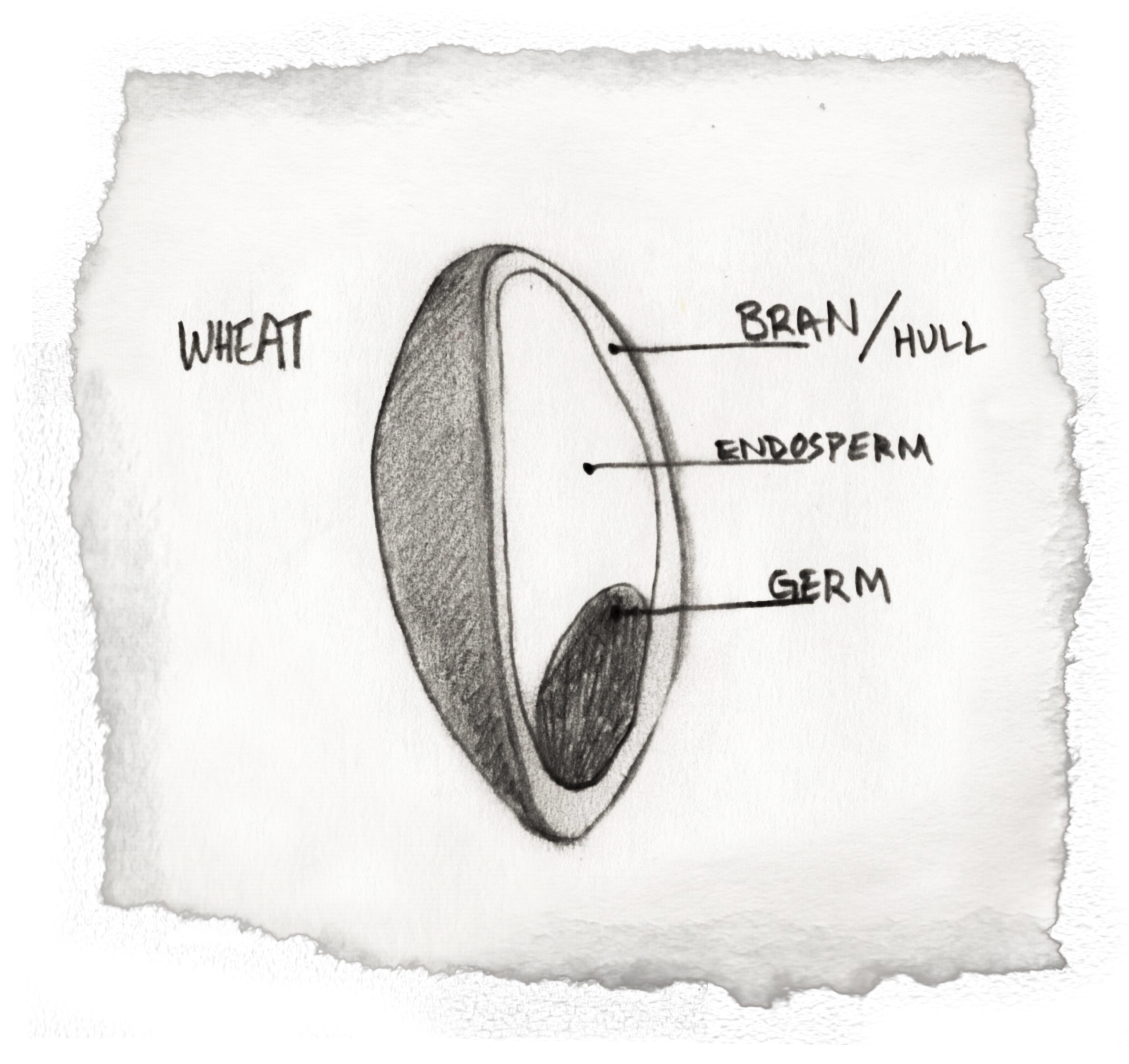 The Endosperm is the food and energy source for the growing wheat plant. This starchy section is what we think of as powdery white flour, after it’s milled.