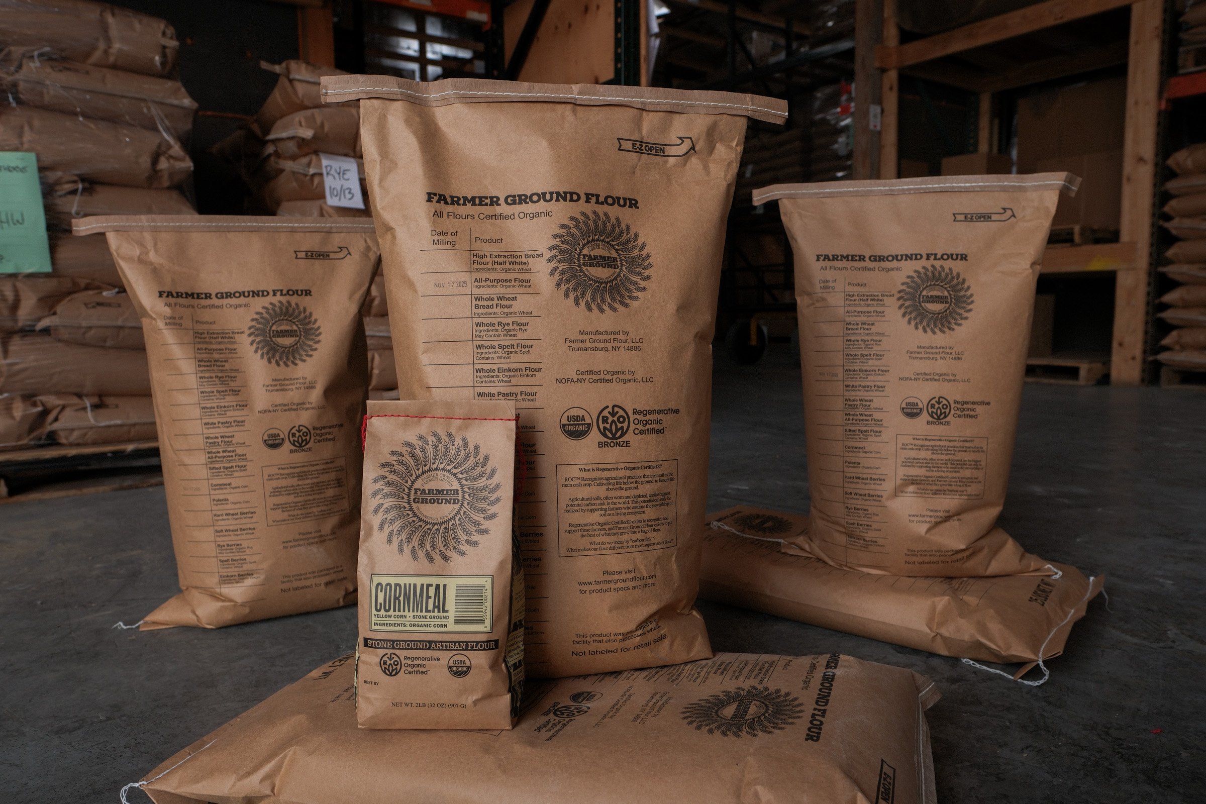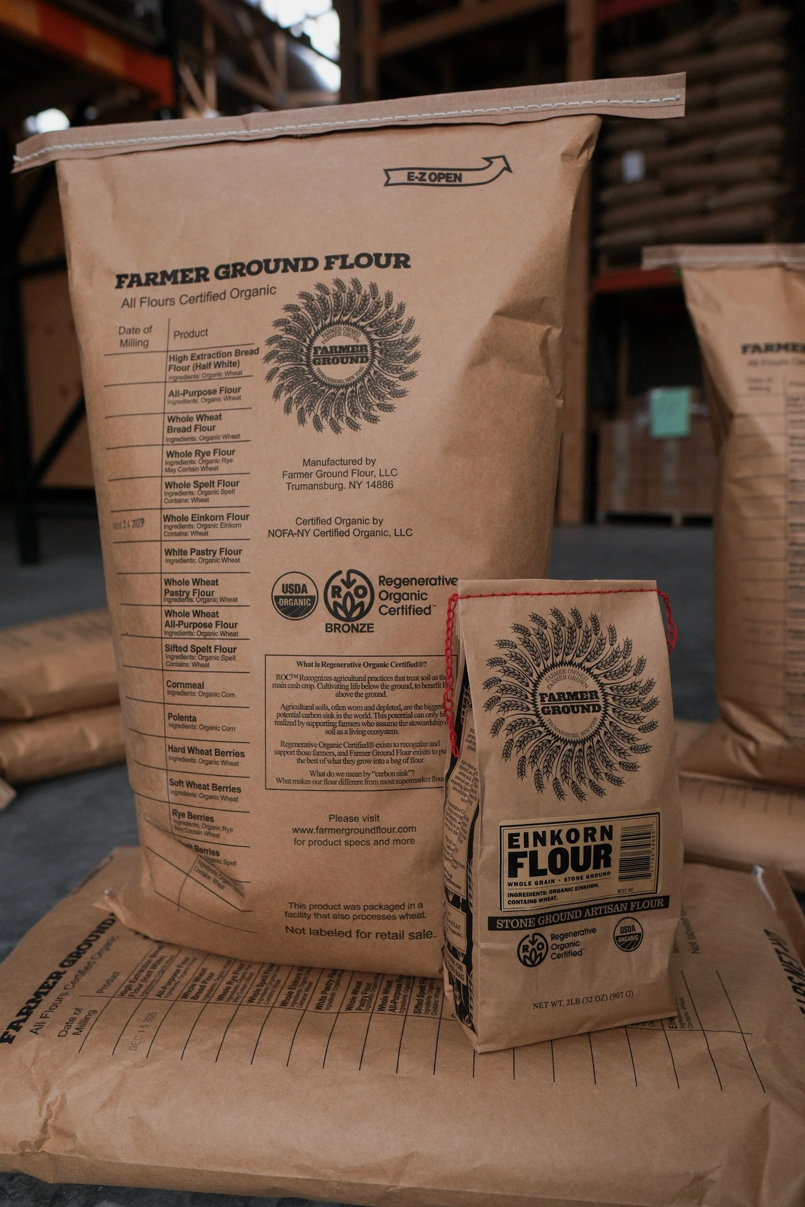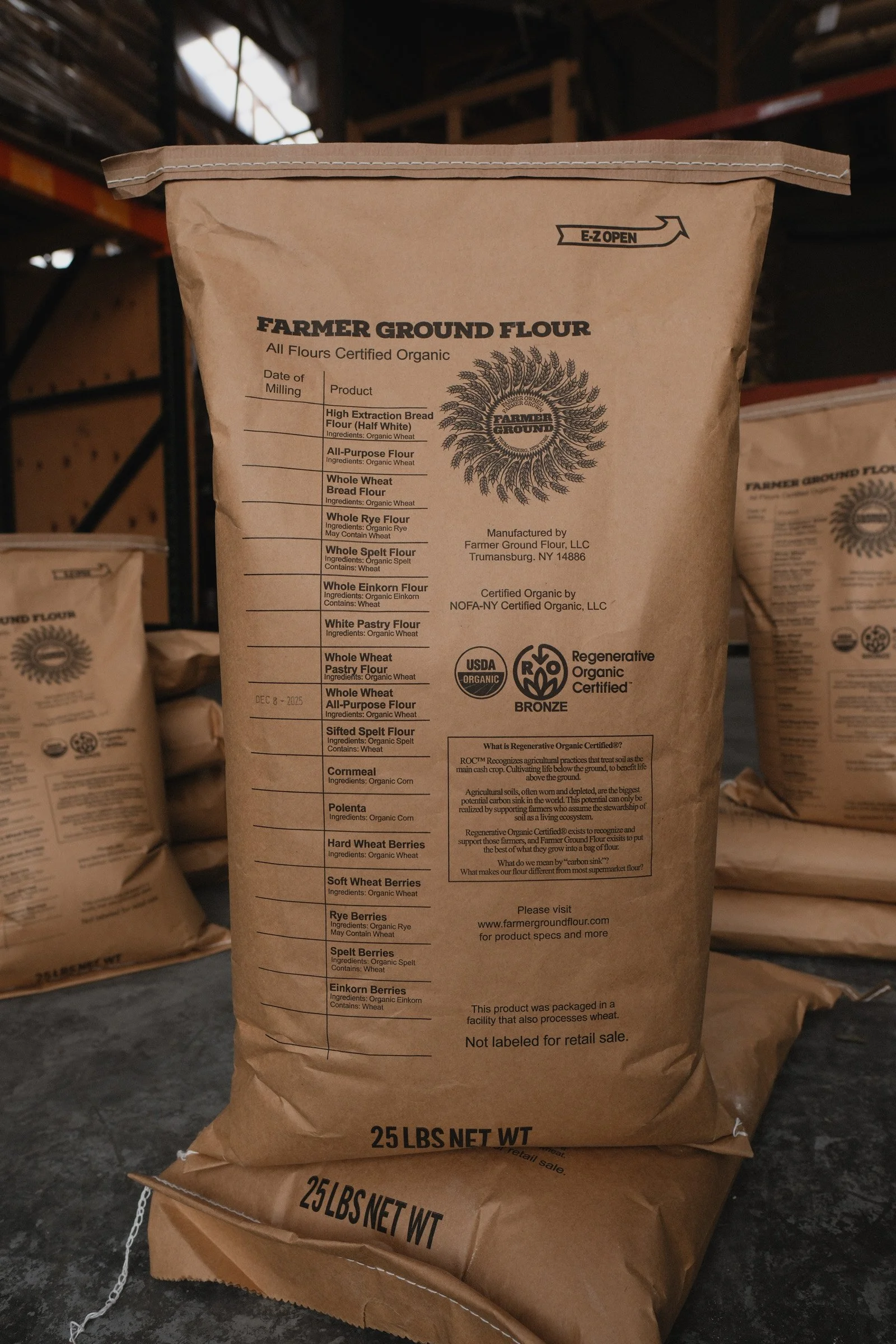 We don’t call our flour “white” (although be aware that several retailers do label it that way on the shelf!) because it is produced very differently than commercial white flour. Modern commercial mills use roller milling to remove 100% of the bran and germ (the healthiest parts) from the endosperm (the starch) before milling the endosperm into that paper white flour. Sometimes this flour is even bleached for whiteness. These flours will last on the shelf indefinitely because they have little nutritional value. After the removal of the bran and germ, this process yields about 70lb of flour from 100lb of grain, so it is also called 70% extraction.