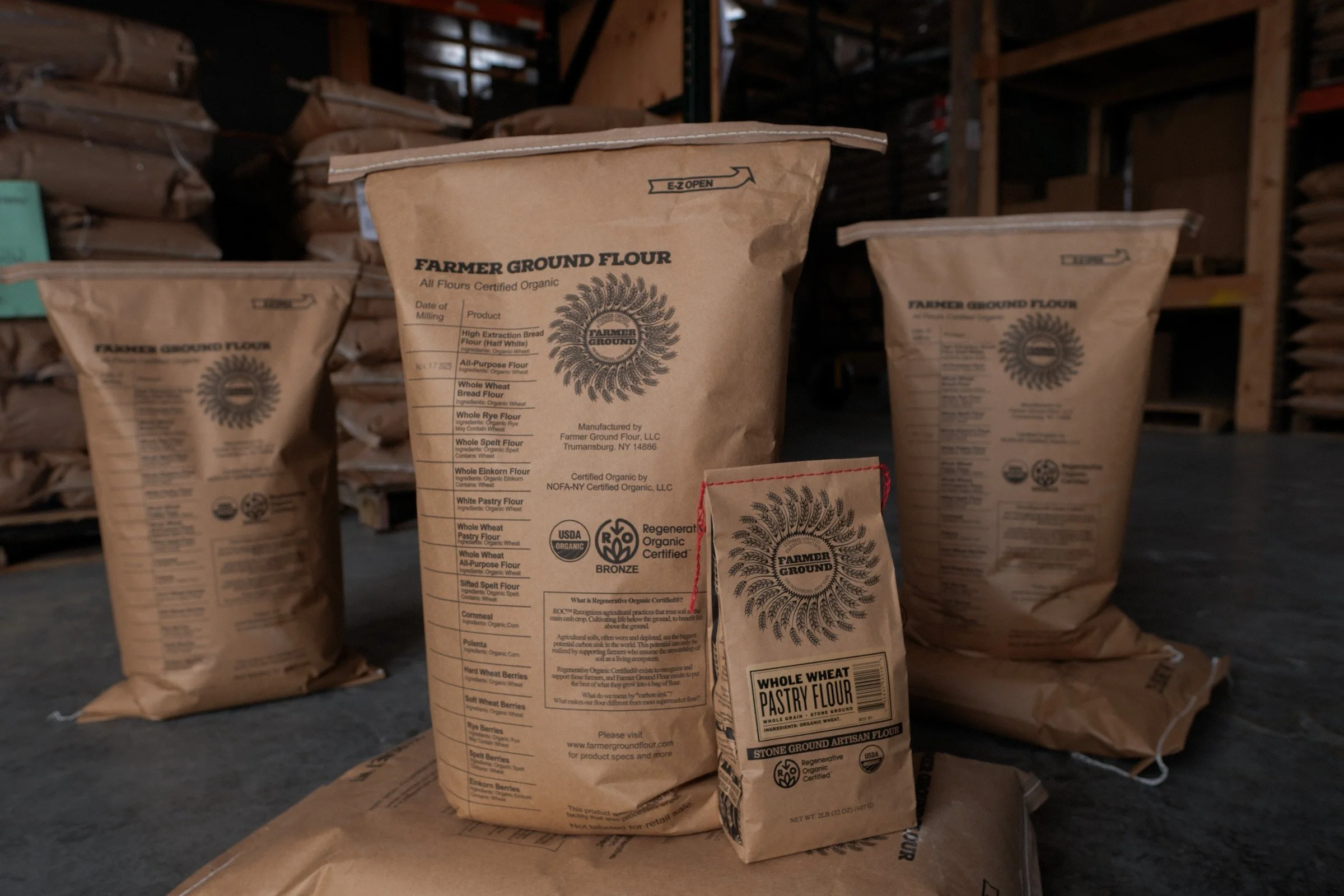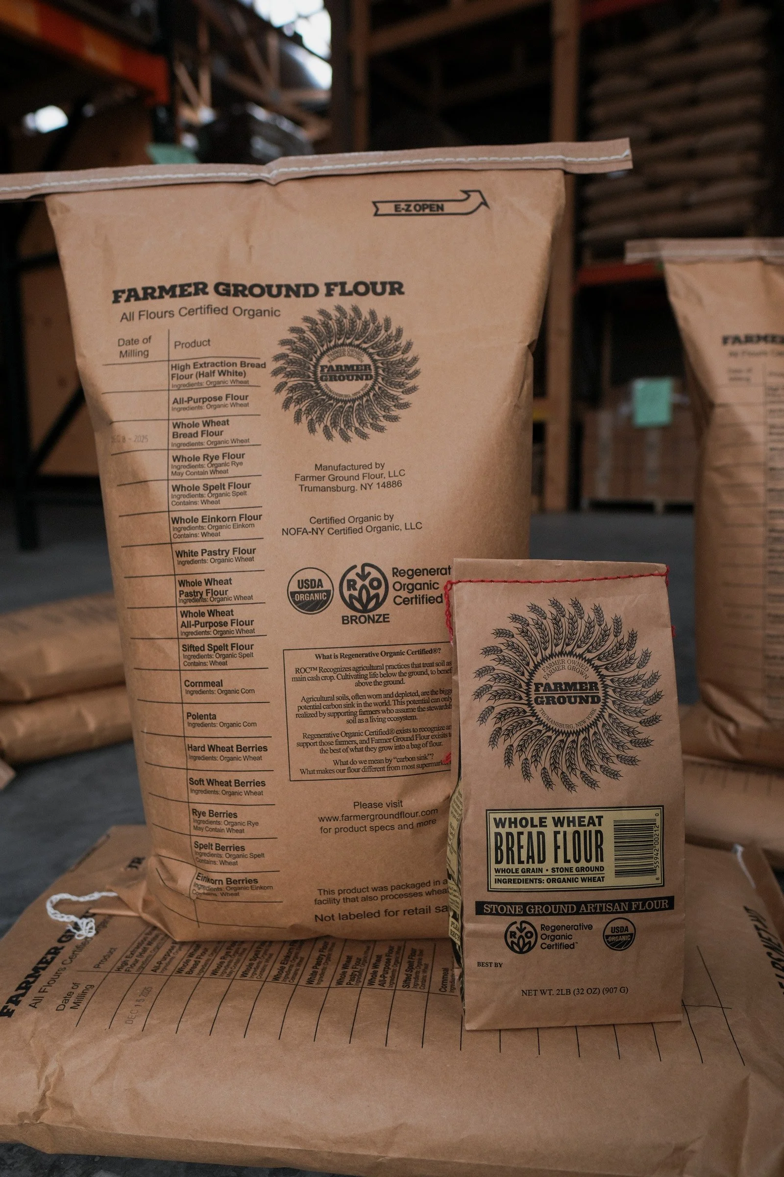 They are actually milled the exact same way, from the same grain (see “What is your “high extraction” flour?” above for more details on that), but then we just skip the sifting. So 100lb of grain yields 100lb of flour, aka 100% extraction. So all the nutritional value of the grain is transferred into the flour, but there will also be larger flakes of bran in the final product.